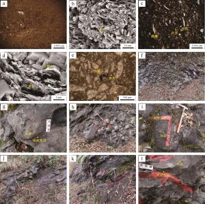 • 四川盆地茅一段岩性以泥岩、泥质灰岩和灰岩为主(图2),泥质灰岩主要为泥质泥晶生屑灰岩,灰岩可分为泥晶生屑灰岩和生屑泥晶灰岩。泥岩主要成分为滑石(30.00%~75.40%)和石英(19.70%~24.60%),镜下见大量滑石(图2a),扫描电镜下也可见大量片状滑石发育(图2b)。泥质泥晶生屑灰岩(图2c)和泥晶生屑灰岩均为颗粒支撑,生屑泥晶灰岩为灰泥支撑,泥质泥晶生屑灰岩滑石含量高(平均为10.21%,图2d),生屑以介壳、有孔虫、苔藓虫为主,泥晶生屑灰岩和生屑泥晶灰岩滑石含量低(平均为0.89%),生屑以钙藻为主(图2e)。