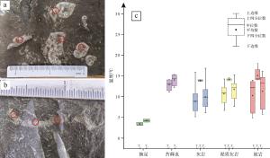 (a) bryozoan shell sampling site, Huayingshan section, hyx-17-1, argillaceous limestone; (b) brachiopod shell sampling point, Huayingshan section, hyx-19-1, bioclastic limestone; (c) comparison of paleotemperature restored by oxygen isotope between biological crust and whole rock