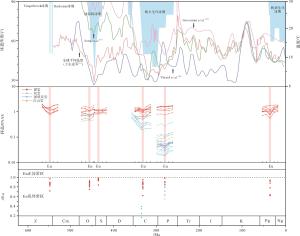• 碳酸盐岩中稀土元素的含量和配分型式等指标记录了其古气候、古环境和流体来源信息[36],其中δEu的正异常(δEu1)对古温度变化具有重要的指示意义,其多指示高温或热液环境[37],而δEu的负异常(δEu1)则多解释为沉积母岩为花岗岩、低温还原环境或被动大陆边缘环境[3839]。通过调研震旦纪—古近纪全球冰期与δEu异常特征,发现冰期内的泥岩、灰岩或白云岩的δEu均呈负异常特征,二者具有良好的对应关系。
