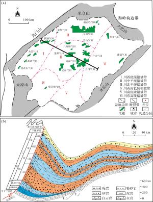 图  1  (a)四川盆地及周缘构造特征、构造单元划分及须家河组主要气藏分布(气藏分布据文献[23]);(b)川西—川中北西—南东向的晚三叠世—侏罗纪地层剖面(据文献[39]修改)