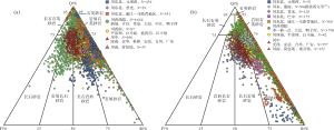 • 四川盆地晚三叠世的演化主要受控于构造的演化,古地理演化经历了由海相环境—海陆过渡相环境—陆相环境的转变,盆地具有多物源、相变快等特点,其中马鞍塘组为海相沉积环境,小塘子组(即须家河组一段)—须家河组三段为海陆过渡相沉积环境,须家河组四段—六段为陆相沉积[23,4243]。上三叠统须家河组的沉积具有多物源的特点:一是盆地周缘存在多个造山带,包括西部的龙门山造山带、北部的米仓山—大巴山造山带、东南部的雪峰古隆起、南部的黔中古隆起和西南部的康滇古陆,影响川西地区的物源主要是龙门山造山带、米仓山—大巴山造山带和康滇古陆;二是龙门山造山带和米仓山—大巴山造山带周期性的强烈逆冲推覆活动和持续隆升,加大了西部和北部两个方向物源的供给[31]。因此,盆内上三叠统巨厚的充填地层,伴随周缘构造山系多期次的挤压推覆以及盆地的沉降,充填序列在垂向上周期性出现以砾石为代表的盆缘巨厚冲积扇相楔状体和盆内以黑色页岩为标志的最大湖侵层,在横向上则表现为不同的沉积体系配置和沉降中心的迁移[43]。这种多物源区的特点也明显反映出须家河组砂岩的类型及各组分的空间变化、地球化学分布规律,物源区母岩持续地向沉积盆地提供陆源碎屑,经沉积、成岩等作用形成碎屑岩储层,储层的储集物性与陆源碎屑的成分密切相关。