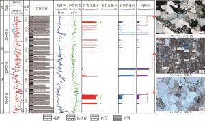 Figure  5.  Vertical distribution of rock components and representative thin⁃section features of member T3x⁴ sandstone in well Chuanfeng 563, Western Sichuan Depression