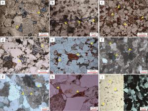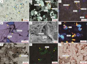 • 须家河组致密砂岩储层碳酸盐矿物的溶解主要表现为碳酸盐岩屑溶蚀形成的粒内溶孔(图9i),碳酸盐胶结物溶蚀少见。碳酸盐岩屑粒内溶孔主要见于富碳酸盐岩屑的砂岩储层,在川西地区须四段砂岩中最为常见。相比于长石和岩浆岩岩屑的溶蚀,碳酸盐岩屑的溶蚀程度普遍偏低,多为颗粒内部及边缘的局部溶蚀(图9i)。