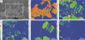 Figure  11.  Intragranular dissolution pores formed by feldspar dissolution and subsequent calcite cementation with residual pores, well DY1, 4 194.72 m, member T3x⁴: (a) backscattered electron (BSE) image; (b⁃f) Ca⁃Al⁃K⁃Na⁃Fe element distribution maps