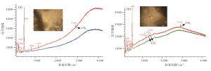 图  12  (a)拉曼衍射曲线及包裹体显微照片,2 914峰值指示CH4,川合139井,3 781.79 m,须四段;(b)拉曼衍射曲线及包裹体显微照片,2 914峰值指示CH4,1 282/1 386峰值指示CO2,新场31井,3 740.38 m,须四段