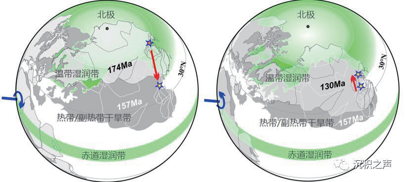 然而,我们进一步缩小聚光灯去看,真极移的故事还远没有结束。现有的真极移模型认为侏罗纪-早白垩世的真极移实际上由两部分组成,两次真极移的旋转中心都在赤道非洲的西部,在第一次30°左右顺时针的真极移之后,还存在第二次10°左右逆时针的真极移事件(Kent and Irving,2010),这也得到华北地区古地磁数据的支持。中侏罗世至早白垩世期间,燕辽地区非常完美地保存了两个生物群的化石,即著名的燕辽生物群和热河生物群。这里发现了长有美丽羽毛的恐龙、最早的开花植物等,曾因此多次登顶世界顶级科学杂志,惊艳了无数的读者。而这些生物群的兴衰无疑与燕辽地区古环境变迁历史密切相关。如前面所讲,第一次真极移事件(约1.74亿年到1.57亿年前)导致东亚地区整体上由温带湿润带进入热带/亚热带干旱带,这一时间节点与燕辽生物群的消亡时间(约1.6亿年到1.55亿年前)一致;而第二次真极移事件(大约发生在1.45亿年到1.20亿年前)导致东亚地区反向向北发生10°左右的北向漂移,使得晚侏罗世处于干湿气候带交界处的燕辽地区再次进入温带湿润区,这一古地理位置的变化为热河生物群在大约1.3亿年到1.2亿年之前的重新兴起创造了有利的环境条件(图3)。