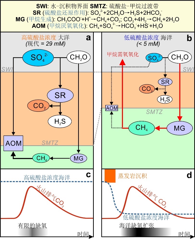 基于上述数据与模拟结果,He et al. (2020)认为海洋沉积物中“产甲烷”作用 (MG;CH3COO- + H+ → CH4 + CO2; CO2 + 4H2→CH4 + 2H2O) 和海底甲烷溢出是极低硫酸盐浓度驱动海洋缺氧的关键机制(图3),即在低海洋[SO42-]的背景下,沉积物中有机质更多地参与产甲烷作用,而海底沉积物中甲烷的产出和海底溢出速率大于向孔隙水扩散的速率,由于沉积物中硫酸盐作为氧化剂的甲烷厌氧氧化作用被抑制,大量甲烷溢出海底并消耗底水溶解氧,从而导致缺氧水体扩张和黄铁矿埋藏[3]。在现代海洋和大部分湖泊中,水柱是充分氧化的,而在沉积物中,随着孔隙度和硫酸盐扩散深度的增加,氧化剂含量逐渐降低,从而形成了氧化还原分带。在硫酸盐还原菌的作用下,孔隙水中的SO42-首先与有机质反应(SR;SO42-+ 2CH2O → H2S + 2HCO3-),形成“硫酸盐还原带”;在此之下的“产甲烷带”中,产甲烷菌利用沉积有机质产生并释放甲烷,并与SO42-进行甲烷厌氧氧化作用(AOM;CH4 + SO42-→HCO3- + HS- + H2O),在二者达到平衡的深度形成“甲烷厌氧氧化界面(SMTZ)”(图3)。由于现代海洋中海水[SO42-]较高(~29mM),经过SR作用消耗后,还有充足的SO42-扩散到沉积物更深处,形成较宽的“硫酸盐还原带”。该过程中,孔隙水中[SO42-]的扩散供给速率大于甲烷的溢出速率,因此“甲烷厌氧氧化带”被限制在更深处(图3-a)。相反,当海水[SO42-]较低时,孔隙水中的[SO42-]也随之降低,一方面导致SR受限,“硫酸盐还原带”变窄,另一方面无法抵消甲烷的溢出速率,导致SMTZ界面上移(图3-b)。在三叠纪末期,由于海水[SO42-]极低(<1mM),甲烷得以溢出水岩界面(SWI)进入海水水柱,从而大量消耗海洋底水的溶解氧,引起海底缺氧水体面积迅速扩张(图3-d),继而加速了黄铁矿埋藏速率,最终导致海水δ34SCAS大幅度正漂移(图2)。在现代大洋中, 90%以上的海洋生物生活在大陆架上,因此大陆架沉积物中埋藏了~98%的有机碳。作者对全球陆架沉积物中的SR作用消耗有机碳通量和“产甲烷”作用消耗有机碳通量分别进行了估算,结果显示如果将现代海洋[SO42-]降低到1mM以下,全球范围内海底沉积物中的甲烷产生通量将增加6~7倍。若这部分甲烷溢出海底进入海水水柱,将对底水溶解氧造成巨大的消耗。