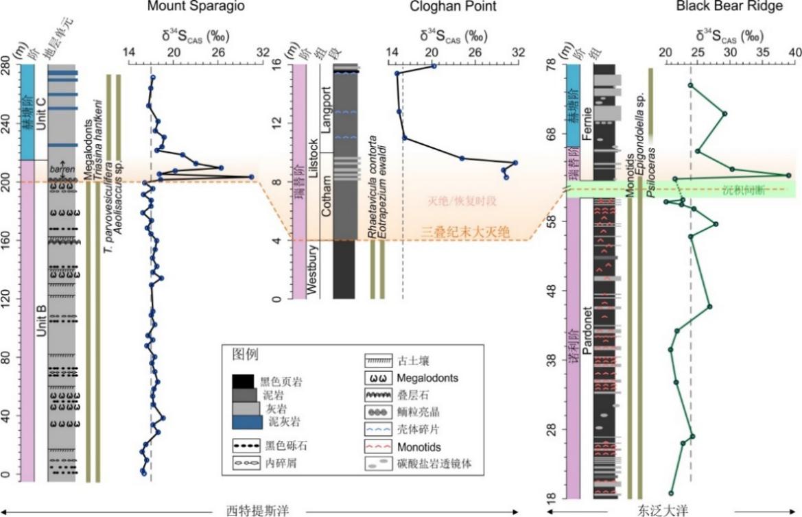 图2 西西里岛(Mount Sparagio)、北爱尔兰(Cloghan Point)和英属哥伦比亚(Black Bear Ridge)三叠纪末大灭绝事件期间的海水硫酸盐硫同位素数据[4]。
