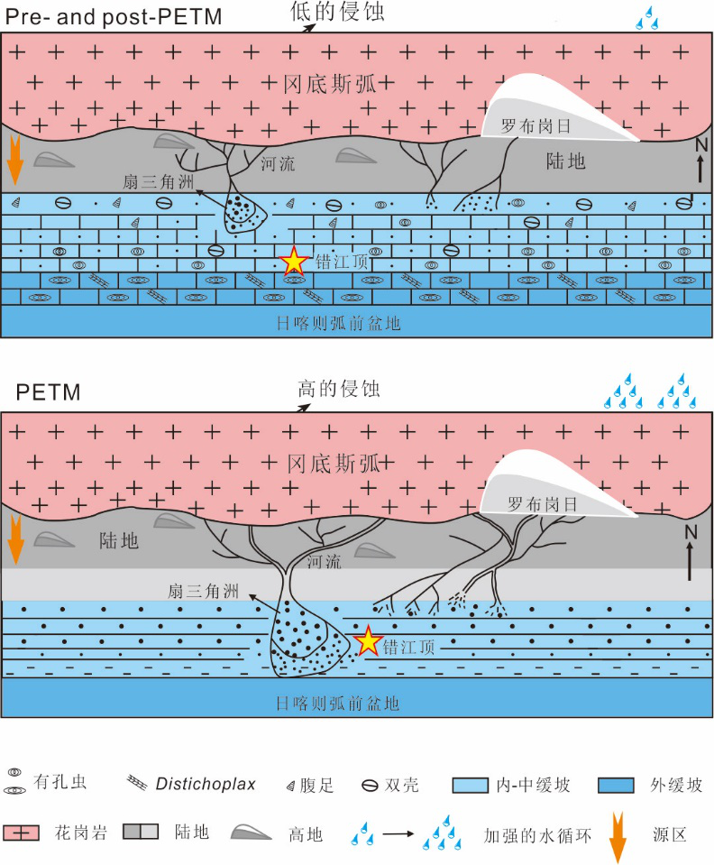 图7 藏南错江顶地区PETM前后环境演化模式图(Jiang et al., 2021)