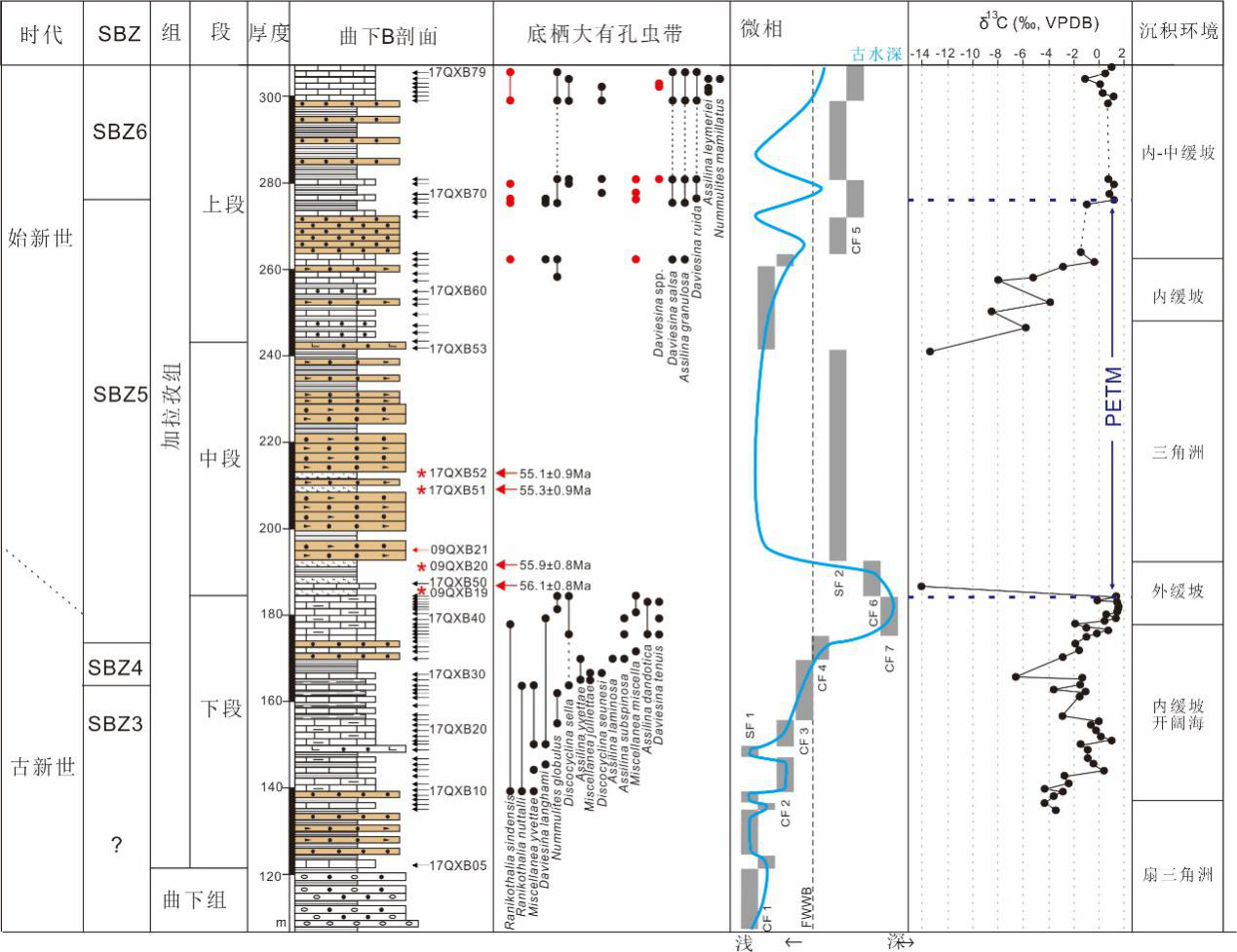 西藏南部日喀则弧前盆地错江顶地区,属于亚洲南缘,保存了连续的古近纪沉积(加拉孜组),是研究PETM事件潜在的有利地区(Hu et al., 2016)。加拉孜组整体可以分为三段,下段和上段以泥质岩夹碳酸盐和少量砂岩为主,碳酸盐中含丰富的底栖大有孔虫;中部以砂岩夹泥质岩为主,并出露多层凝灰岩(图4)。其中底栖大有孔虫和凝灰岩是限定地层时代的有力依据。