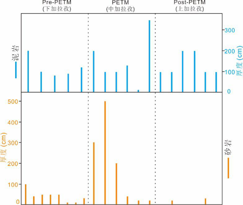 图6 藏南错江顶地区PETM前后砂岩、泥岩厚度对比(Jiang et al., 2021)