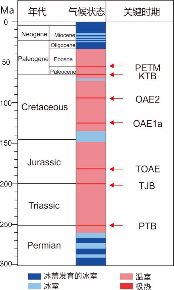 图2 晚古生代以来的温室、冰室气候转变和极热事件(图片修改自“Understanding Earth's Deep Past: Lessons for Our Climate Future”,2011)