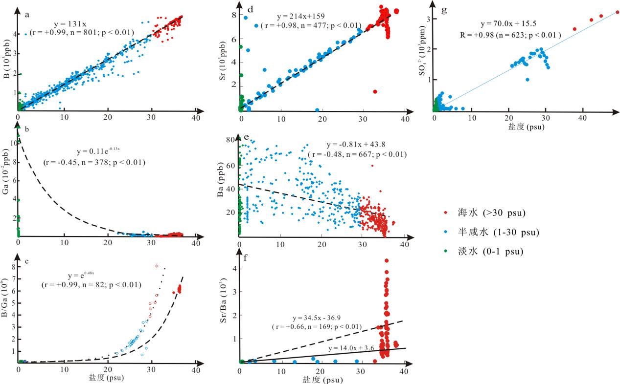 图1 a, b, c:水体中B,Ga的浓度以及B/Ga比值与水体盐度交汇图;d, e, f:水体中Sr,Ba的浓度以及Sr/Ba比值与水体盐度交汇图;g:SO42-比值与水体盐度交汇图