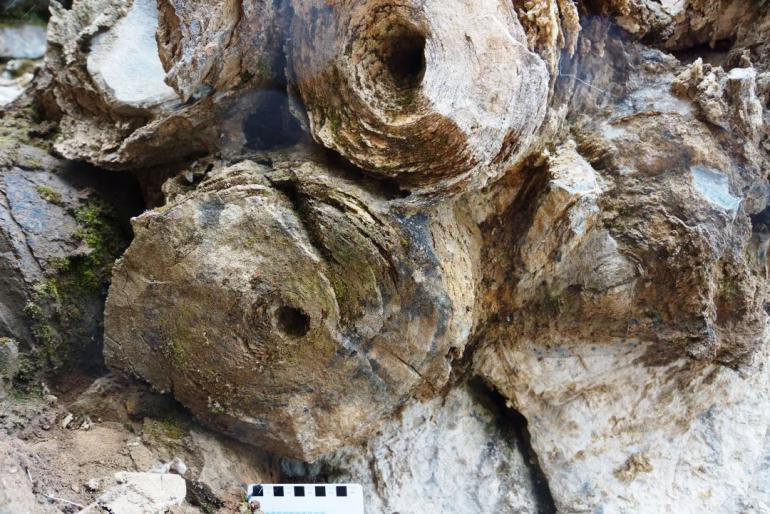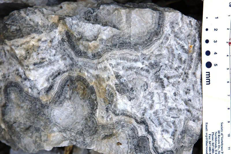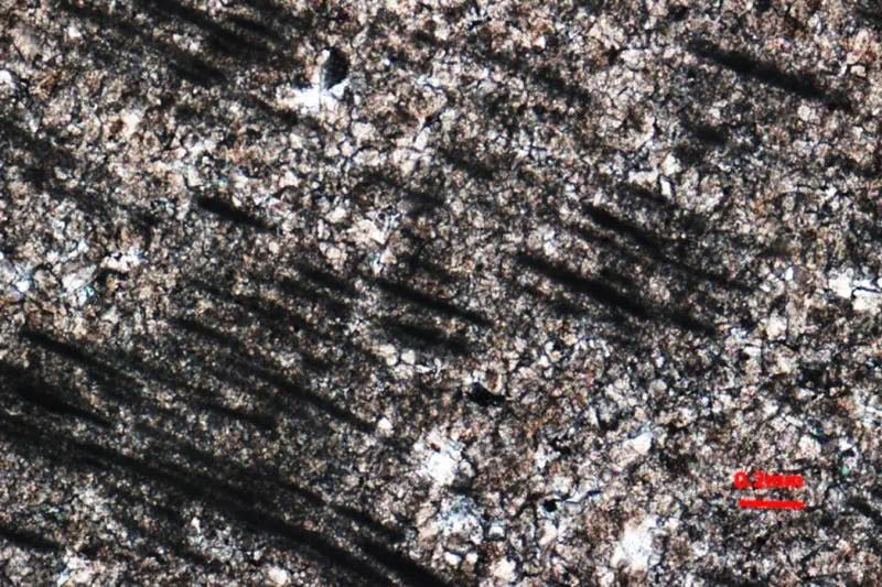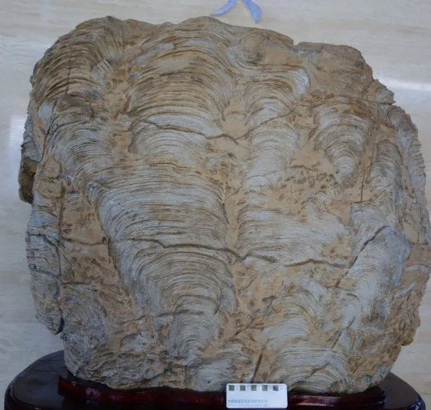 叠层石——古老的生命印迹(图7-10)。在地球演化过程中,在岩石中有一种奇特的微生物成因的沉积岩,称为微生物岩,叠层石是其中最重要和最显著的一类。它纵贯地球历史近38亿年,记录了地球上最原始的生命现象,它的兴衰与地球不同时期的重大表生地质事件和环境演变密切相关,具有重要的科学研究意义。这种由特殊的、含有地球上最早期最主要生命存在形式的、类似现代海洋或湖泊当中的蓝藻类生物形成的叠层石,在神农架的中元古代碳酸盐岩地层中广泛发育,叠层石的典型特征就是由一层层向上凸起的纹层组成的柱体组成,有的柱体相互连接,使纹层成波浪状,也有的柱体互不相连,柱体间被泥质等充填。叠层石的宏观形态各不相同(图7-8),反映了它形成时的水体环境水深各异,从层—穹—柱—锥,一般指示水深越来越大。叠层石不仅是神农架世界地质公园最重要的地质遗迹,而且代表着地球早期独特的生命存在形式,更重要的是它为后来地球上其他生命的诞生创造了条件,即创造了富氧气的大气环境,因此它是地球上生命诞生的最大功臣。叠层石的内部,在显微镜下可以看到藻丝体或其残留的有机质(图9),正是这些藻类的作用,形成了这些宏观形态上各异的微生物岩类型。更为奇妙的是,它的纹层一明一暗交替出现,可能是日(夜)纹层:白天生命活动旺盛,光合作用强烈,形成富藻(有机质)的暗色层;夜晚生命活动处于静止和停息,有机质贫乏,形成主要由碳酸盐结晶颗粒构成的亮层。同时,受波浪、潮汐及水动力强弱、碎屑物质供应量等的影响,形成纹层样式各不相同的奇妙叠层构造(图7-10)。也有人认为,叠层石的纹层是以年为周期,夏天形成暗色纹层,冬天形成亮色纹层。有研究通过这些纹层数目及纹层厚度与间距的精确测量,估算出6亿年前及10亿年或十几亿年前地球上的一天或是一年的时长;无论哪种解释与推理,都说明叠层石具有“生物钟”的作用。这也是一种科学研究方向和思路。