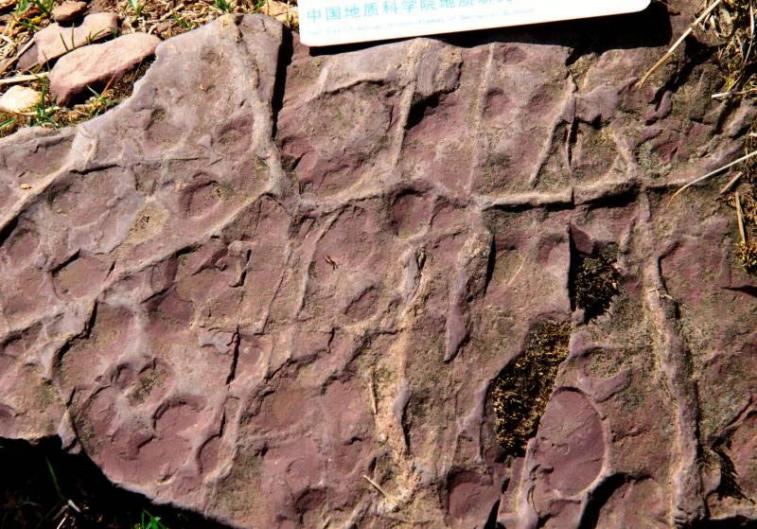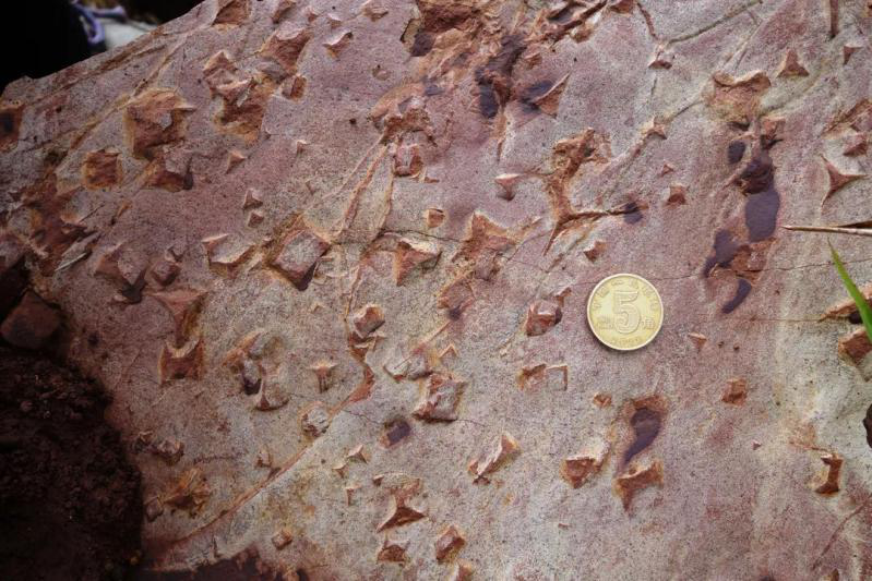 干裂(图11)与石盐假晶(图12)——干热环境的见证。在干旱、炎热的环境下,现代海滩、湖滩或河滩上,干裂或泥裂纹等等的出现可谓司空见惯。而在岩石上也可以看到这些构造,其次还可以看见一些盐类和石膏等,都是这种环境下的产物。近岸或浅水的泥质表面原本浸润在水下,但由于天气干旱,水体蒸发强烈,泥质的表面暴露到地表(水面上),很快就由于水分的丧失而开始张裂,裂开形成不规则的网格状块体。视泥质层的物质成分差异、厚度、表面积大小不同等等因素的影响,裂开的网格大小、形状、裂开的深度都不相同;后期这些裂缝中被砂质等充填,它们一起埋藏到地下,经历成岩作用固结成岩石,便被保存下来。而当岩石中发现的石盐假晶,那是石盐晶体在岩石中留下的印迹。之所以称为“假晶”,是因为这只是晶体的假象:原先的石盐晶体,在成岩过程中,石盐化学成分早已流失掉了,其晶格被其他成分充填取代;变成岩石后,仍然保留着石盐晶体原先的形态。在很多地方类似这样环境形成的石头上,都可以看到“石盐假晶“。