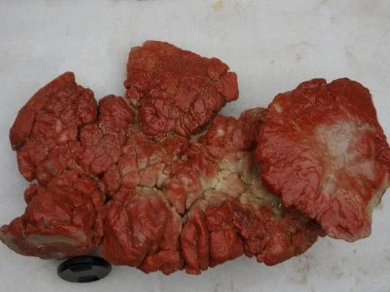 “经络石”(图15)、“发丝石”(图16)、“梅花玉和鸡血玉”(图17)——来自热液与构造的自然合体。神农架的岩石当中还有一些由于后期热液作用导致的变质构造,当地管它叫经络石,这是由于来自地球深处的热液作用,与已经形成的岩石在裂缝或是孔隙中发生物理化学变化,重结晶或形成新矿物,出现一些不规则的图案或裂缝充填构造。这个热水效应作用过程中,一种会沿着孔缝的边界进行,形成马牙状或栉壳状结构,这是典型的经络石;另一种热水效应发生在仅有微裂隙的岩石中,暗色泥质或铁质沉淀,形成马尾丝状或头发丝状脉体(图16);同样,由于热水效应导致碳酸盐岩硅化变质,同时沿断层面受富铁物质的浸润,形成鲜红的硅质白云岩或裂缝中形成玛瑙,这就是神农架地区所谓的“梅花玉”和“鸡血玉”的成因(图17)。