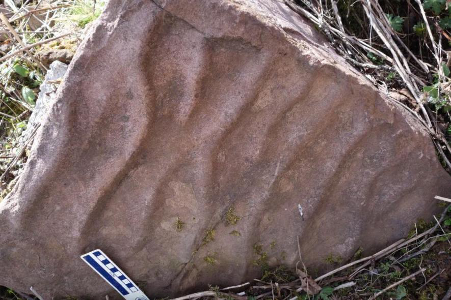 证据之一:存在稀奇古怪、大小不同、棱角分明的大砾石,并且许多砾石表面具有很多刻痕、划痕,地质学家管它叫作冰碛岩,是一种冰川携运到陆地、或者说由冰滑行到海洋当中而堆积下来的沉积岩(图13)。