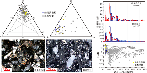 特提斯喜马拉雅南带发育印度北缘浅水沉积地层。上三叠统地层包括土隆群(泥灰岩、生物碎屑灰岩)、曲龙贡巴组(黑色泥岩、粉砂岩、细砂岩)和德日荣组(石英砂岩)(图4),沉积于滨岸至内陆棚沉积环境。研究发现,曲龙贡巴组的砂岩碎屑组分、碎屑锆石U–Pb年龄和Hf同位素特征与郎杰学群均一致(图5)。由于曲龙贡巴组确定属于特提斯喜马拉雅,它与郎杰学群一致的物源特征也就证实了后者亦为印度大陆边缘原地沉积地层,并非外来地质体。