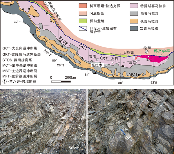 图2 喜马拉雅构造分带图(显示郎杰学群位置)及郎杰学群野外照片。