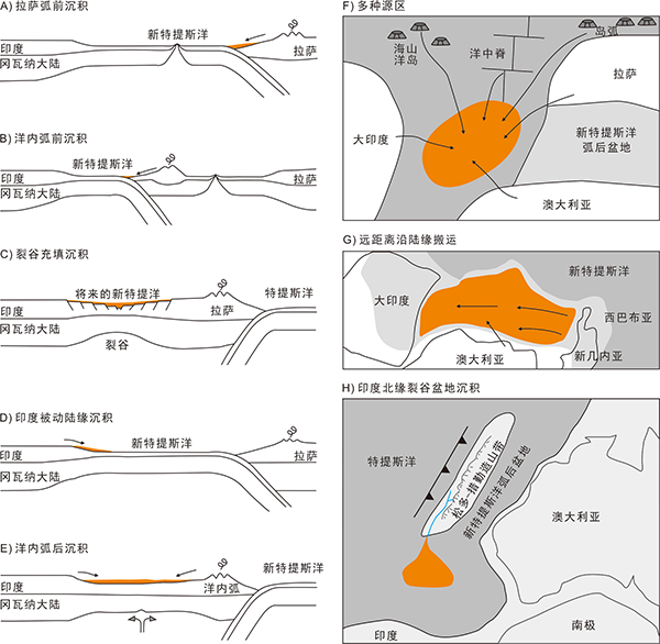 图3郎杰学群成因模式(修改自Wang et al., 2016)。A,拉萨弧前沉积模式 (Li et al., 2010):认为郎杰学群是冈底斯弧前沉积,在印度-亚洲大陆碰撞过程中推覆到印度之上;B,洋内弧前沉积模式 (Li et al., 2010) :认为郎杰学群是大洋岛弧弧前沉积,在印度-大洋岛弧碰撞过程中推覆到印度之上;C,裂谷充填沉积模式 (Dai et al., 2008):认为郎杰学群是拉萨地体从印度裂解时期的沉积记录,物源主要来自拉萨地体,因大陆裂解被部分保留在印度大陆北缘;D,印度被动陆缘沉积(Cao et al., 2018):认为郎杰学群是印度大陆北缘原地沉积,火山物质和古生代-中生代碎屑锆石来自印度北缘的基性岩;E,洋内弧后沉积模式(Ma et al., 2019):认为郎杰学群沉积于特提斯洋内向南俯冲而形成的大洋岛弧的弧后,沉积物同时来自印度和洋内弧;F,多源区沉积模式 (Li et al., 2016):认为郎杰学群包括多个物源区,包括澳大利亚、印度、拉萨以及洋壳、海山;G,远距离沿大陆边缘搬运再沉积模式 (Cai et al., 2016):认为沉积物来源于西巴布亚,沉积物沿澳大利亚西缘搬运至印度北缘沉积,认为郎杰学群与澳大利亚西缘的同时期沉积岩具有相同的源区;H,印度北缘裂谷盆地沉积(Liu et al., 2019):认为郎杰学群源自拉萨地体之上的松多造山带,并认为拉萨地体北侧存在向南的俯冲作用。