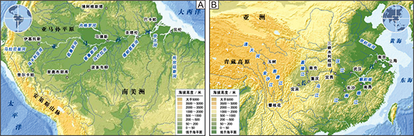 图1 现代横跨大陆的河流体系。A,亚马逊河将南美洲西海岸安第斯山脉的碎屑物质搬运至大西洋一侧;B,长江、黄河等将青藏高原的碎屑物质搬运至亚洲大陆边缘。