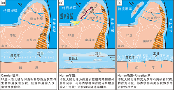 既然冈瓦纳大陆的构造格局在古生代已经成型,为什么郎杰学群的沉积作用仅发生在晚三叠世呢?我们初步认为这可能与冈瓦纳大陆北缘区域性的拉张事件有关。在拉张作用之前,印度北缘以碳酸盐沉积为主,盆地性质稳定,陆缘碎屑输入有限,源自冈瓦纳大陆东南缘的河流并未流向印度北缘;拉张作用发生,沿裂谷走向的隆起区改变了古水系的流向,导致郎杰学群沉积作用发生;拉张作用结束之后,导致郎杰学群沉积的古地理格局不复存在,相关的沉积作用结束,印度北缘发育稳定的石英砂岩沉积(图7)。当然,这一模型虽然能合理地解释现有的各种数据,且很好地吻合当时的区域构造背景,但详细的古地理重建还需要大量的研究工作。