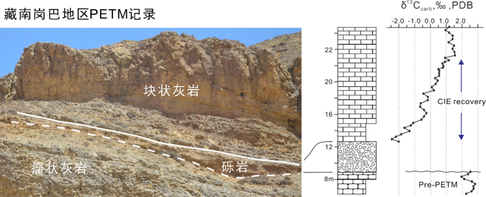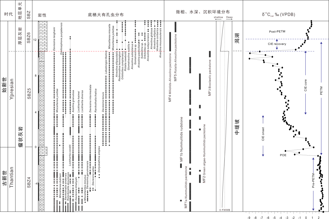 近年来,我们课题组对对岗巴地区宗浦组进行了详细的生物地层学和沉积学工作(Li et al., 2017)。研究发现,PETM事件之前(Pre-PETM),岩性以瘤状灰岩为主,底栖大有孔虫生物带为SBZ4(Shallow Benthic Zone,简称SBZ),沉积环境为碳酸盐岩中缓坡沉积;在PETM事件恢复段(CIE recovery),岩性以块状灰岩为特征,底栖大有孔虫生物带为SBZ6,沉积环境为潟湖。可见底栖大有孔虫组合和沉积环境在PETM事件的恢复段发生突变,二者之间存在一次明显的古水深变浅事件,以瘤状灰岩与块状灰岩之间的砾岩层为标志,但是由于PETM起始段在岗巴地区缺失,无法查明PETM起始段(CIE onset)古水深变化(图4)。随后,Zhang et al.(2018)对宗浦组做了详细的底栖大有孔虫生物地层工作,并限定PETM事件起始于底栖大有孔虫生物带SBZ5内,底栖大有孔虫生物组合变化发生于PETM恢复段而非起始段。根据碳同位素等地球化学分析认为,在浅海PETM CIE幅度可达7‰,可能为PETM CIE的真实幅度,据此获得PETM时期碳释放总量少于28000 Pg(Zhang et al., 2017, 2020)。