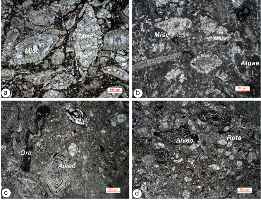 图6 西藏定日地区申克扎剖面典型微相显微照片, a-b)为PETM事件之前、PETM起始及core阶段; c-d)为PETM事件恢复阶段。其中a-b)分别为Nummulitids 砾屑灰岩、Green algae-Nummulitids 泥粒灰岩; c-d)分别为Miliolids-Alveolina 粒泥灰岩、Rotalia-Alveolina 泥粒灰岩