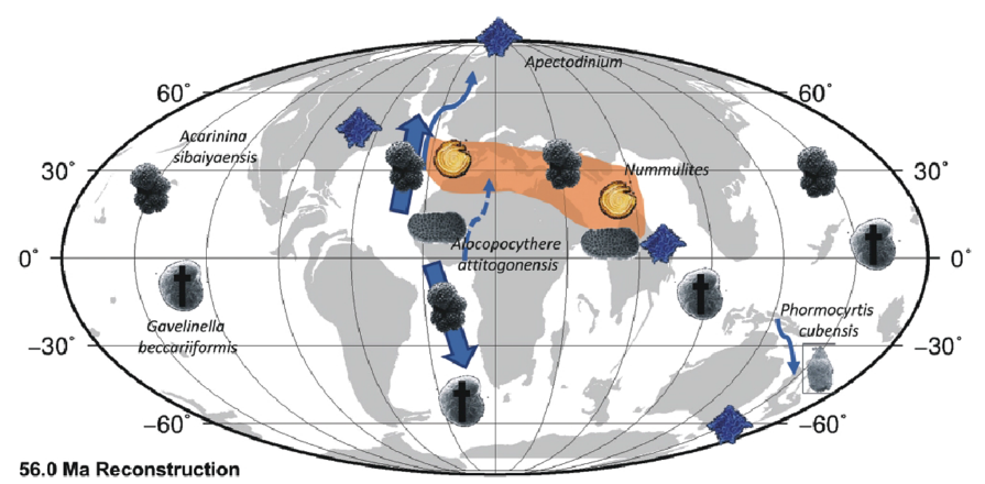图2 PETM事件期间海相生物的响应(Speijer et al., 2012),以Gavelinella beccariiformis为代表的深海底栖有孔虫发生灭绝,低纬度地区Apectodinium、Acarinian、Morozovella向高纬度地区甚至两极迁移; 低纬度地区Nummulites和Alveolina的出现及珊瑚的消失(橙色区域); 以Phormocyrtis cubensis为代表的放射虫亦向两极迁移
