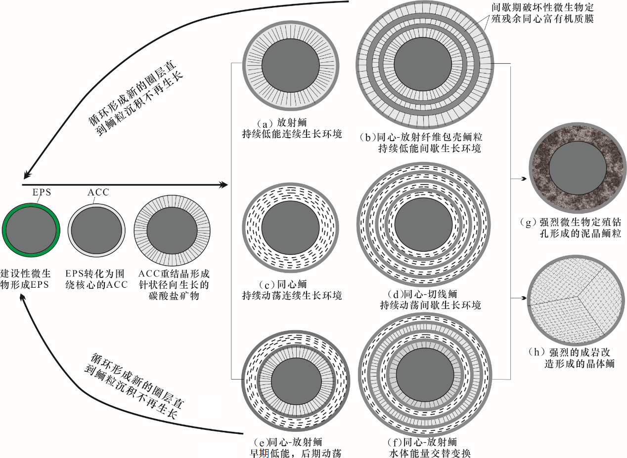 鲕粒的形成不是单一的纯物理化学机制或者微生物机制,微生物通过调节局部碳酸钙饱和度及碱度促进了鲕粒圈层的形成,而水动力的变化改变了鲕粒圈层结构,从而得到丰富的鲕粒类型。不同鲕粒在新的圈层形成前必须经过建设性生物膜—EPS—ACC—矿化成针状碳酸盐矿物这四个过程,新圈层形成后根据水动力条件及鲕粒生长的间歇性将形成几种典型的鲕粒类型(图5):(1)持续低能连续生长环境—生长环境稳定,因此鲕粒圈层能够围绕核心持续径向周期性生长,生物膜后期难以保留,形成典型的放射鲕(图5a);(2)持续低能间歇生长环境—鲕粒圈层围绕核心径向周期性间歇生长,在鲕粒生长间歇阶段,被大量微生物定殖,后期残余的有机质形成明显的同心状分布的富有机质层,这种情况下形成的鲕粒表现为径向生长的放射状圈层和富有机质同心圈层周期性交替,形成同心-放射状纤维包壳鲕(多数学者定义为同心鲕)(图5b);(3)持续动荡连续生长环境—ACC矿化形成围绕核心径向生长的碳酸盐矿物被水动力剪切作用改造成围绕核心的切线状,周期性的切线状圈层包裹鲕粒核心形成典型的同心鲕(图5c);(4)持续动荡间歇生长环境—切线圈层被间歇期微生物定殖形成的黑色富有机质同心圈层分割在不同的小层内,形成同心-切线包壳鲕(图5d);(5)鲕粒形成早期处于静水环境,连续生长径向放射圈层,后期经过短暂间歇环境变的动荡形成连续的切线状圈层,构成典型的同心-放射鲕(图5e、f);(6)鲕粒在形成后,受生物定殖强烈的钻孔影响,原始圈层被破坏,形成泥晶鲕(图5g);(7)鲕粒沉积后期遭受强烈的成岩作用改造,尤其是重结晶作用,形成多晶鲕/单晶鲕,最外层被富含有机质的泥晶套包裹(图5h)。