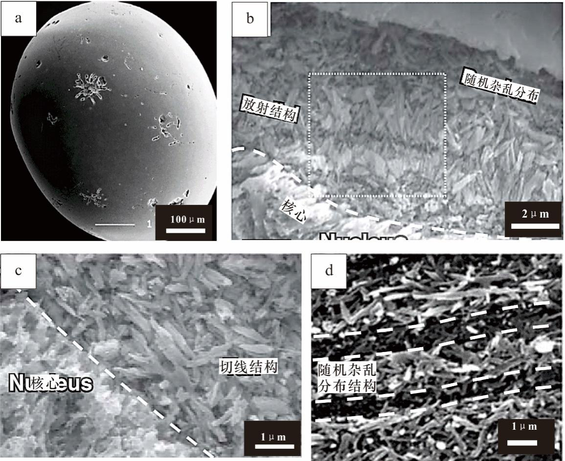 图4 鲕粒圈层结构(a.破坏性微生物钻孔破坏鲕粒结构,图片据Duguid等,2010;b、c.围绕核心的鲕粒放射结构、随机杂乱结构及切线状结构,据Rankey等,2009;d.鲕粒圈层文石杂乱分布,据Folk和Lynch等,2001)