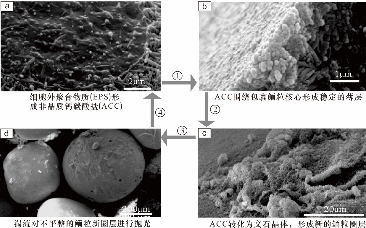近些年来,关于微生物促进鲕粒形成的认识不断加深,例如Folk和Lynch等(2001)研究认为大量鲕粒圈层的沉淀与纳米细菌有关,并且鲕粒中文石切向排列是由粘液的“定向模板”造成的。粘液填充的层与文石层周期性排列构成了鲕粒的圈层结构,而这些富有机质的粘液层在后期腐烂形成了文石层之间的间隙。Summons等(2013)研究认为特定的微生物群落通过代谢活性增加了局部的碱度,促进了碳酸盐的沉淀,进而促进鲕粒皮层的生长。 Diaz等(2017)详细研究了微生物活动对鲕粒形成的影响,认为由微生物活动诱导的碱度和过饱和条件局部增加可导致ACC发展和随后的文石晶体形成,强调了ACC形成的生物过程;将鲕粒的形成总结为以下几个阶段(图3):(1)鲕粒外部圈层微生物细胞外聚合物质(EPS)形成导致碳酸钙的沉淀形成ACC;(2)ACC累积形成薄层;(3)ACC转化为文石晶体,形成围绕核心的新的文石层;(4)动荡的水体磨损不均匀的文石层,形成较为光滑的球形,构成了鲕粒的圈层。