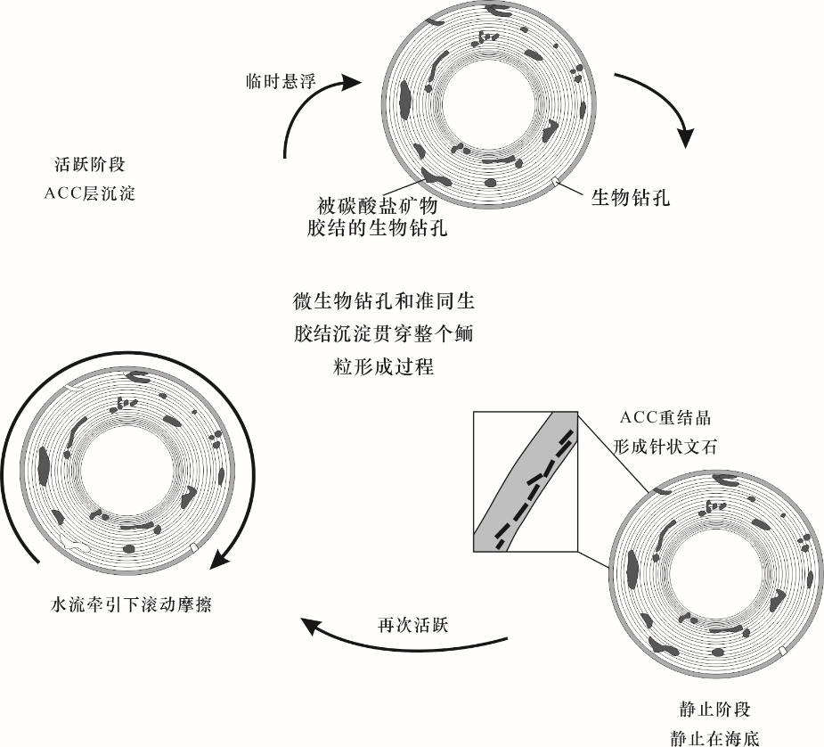 Duguid等(2010)研究认为微生物在鲕粒的形成中不起作用,相反,由于微生物的存在造成的钻孔及与其相关胶结物的形成,改变了原始鲕粒圈层的结构和化学组成,其将鲕粒形成划分为两个阶段(图2):(1)活跃阶段(悬浮搅动阶段)鲕粒表面形成具有相对较高的Mg/Ca比的非晶质钙碳酸盐ACC(Amorphous Calcium Carbonate);(2)稳定阶段(静止阶段)ACC重结晶形成针状文石。