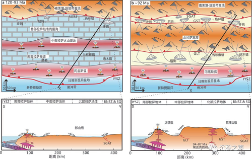 还有一个问题,北拉萨古高原地表初始隆升的时间是什么时候开始的呢?最高海相层在93-92Ma结束、早期形成的山前冲积扇砾岩层中92Ma火山灰、物源区在96-92Ma期间180°转变等地质学证据共同精确地约束北拉萨高原的地表初始隆升开始于~92Ma(图6)。