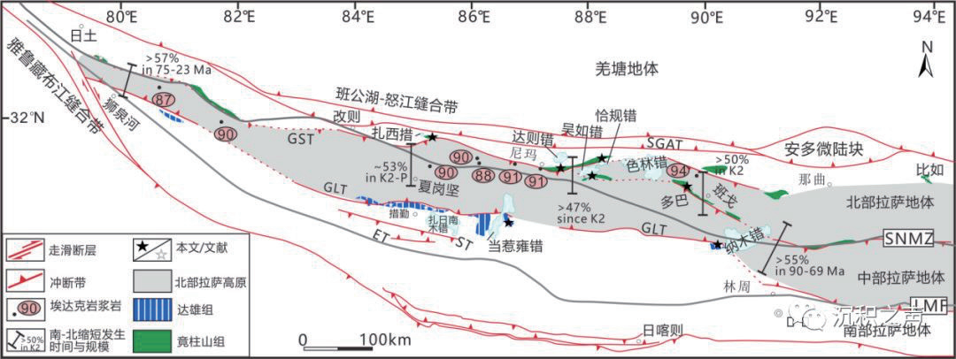 图5北拉萨高原地理分布构造简图,包括埃达克岩浆作用分布、南北构造缩短、冲断带等信息(改自Lai et al.,2019)。缩写代号:K2-晚白垩世;P-古近纪。