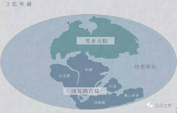 图6.潘基亚泛大陆裂解初期阶段出现的劳亚古陆和冈瓦纳古陆(图源:星球研究所)
