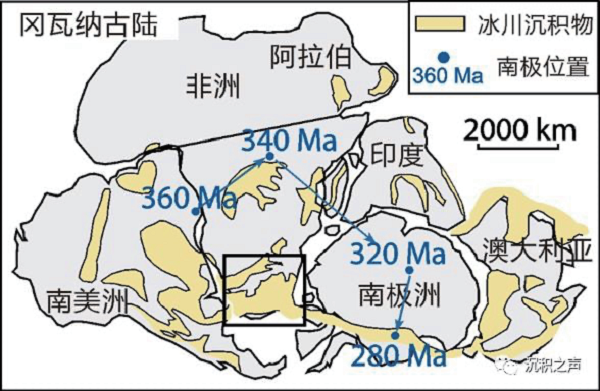 图2.晚古生代大冰期冈瓦纳大陆及冰川沉积(翻译自LeHeron et al.,2019)