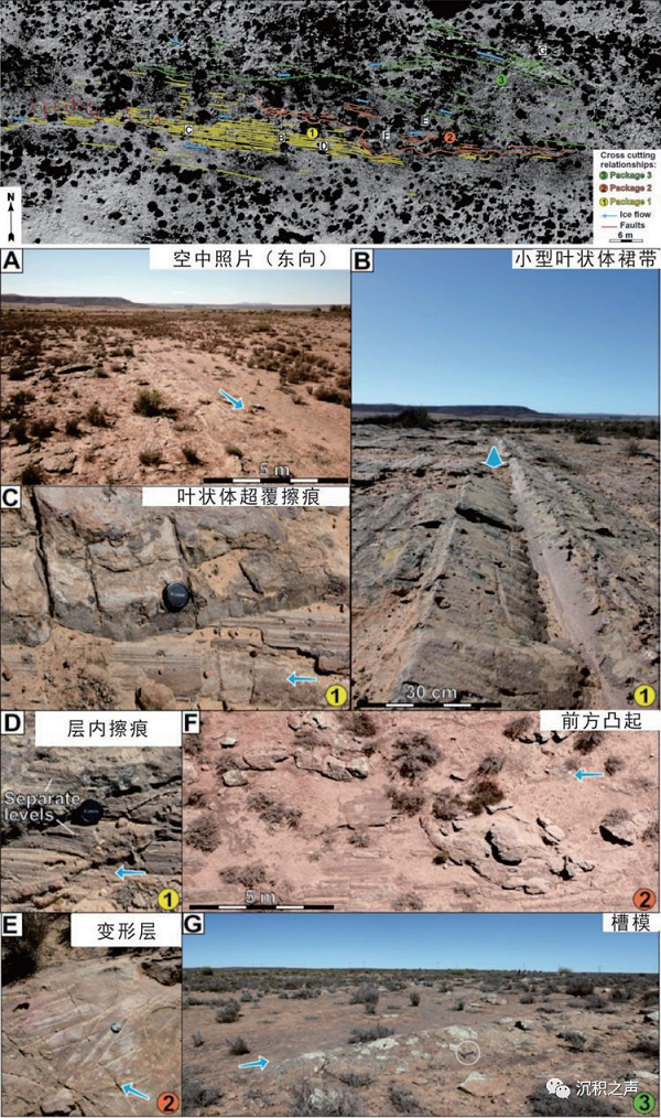 图4.南非卡鲁盆地晚古生代冰下不整合面特征(翻译自Le Heron et al.,2019)。图中蓝色箭头代表冰流方向;不同颜色的圆圈和数字与图中的期次相对应。