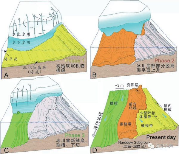 根据这三组不同特征的层面构造的相互切割关系,Le Heron等(2019)认为,它们是由冰川侵蚀位置的侧向迁移导致。第一期:主要以冰川流动侵蚀形成的槽模构造为特征,伴有颗粒流沿槽模一侧形成的小型叶状体裙带构造(图5A)。第二期:由于海平面短暂上升,导致冰川与沉积基底部分脱离,形成似“冰山龙骨”侵蚀而成的推挤、凸起、变形构造(图5B)。第三期:海平面下降,冰川重新触底,形成与第一期相似的沉积构造(图5C)。最终保存了这三期相互切割的沉积构造(图5D)。据此,该冰下不整合面并不能指示间冰期海平面的突然上升,而是代表着冰期发育时期错综复杂的冰川侵蚀过程。同时,文章指出该沉积环境可能是受潮汐作用影响的边缘海环境。涨潮时,海平面上升,冰川被短暂浮起,脱离沉积基底;落潮时,海平面下降,冰川又重新触底侵蚀(图5)。