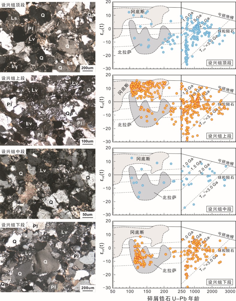 图6 设兴组砂岩的物源特征(Wang et al., 2020)。Q,单晶石英;Qp,多晶石英;Pl,长石;Lv,火山岩岩屑;Ls,沉积岩岩屑;Lm,变质岩岩屑。
