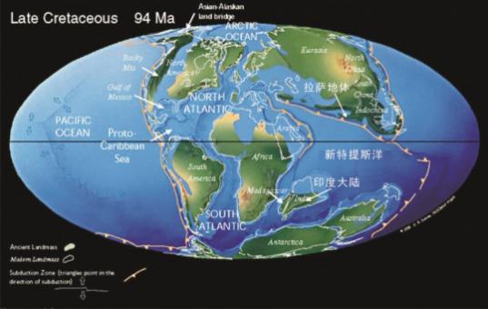 图2 白垩纪中期全球古地理格局,显示印度、拉萨和新特提斯洋的位置。新特提斯大洋岩石圈向欧亚大陆之下俯冲形成活动大陆边缘(图片来自于网络)。