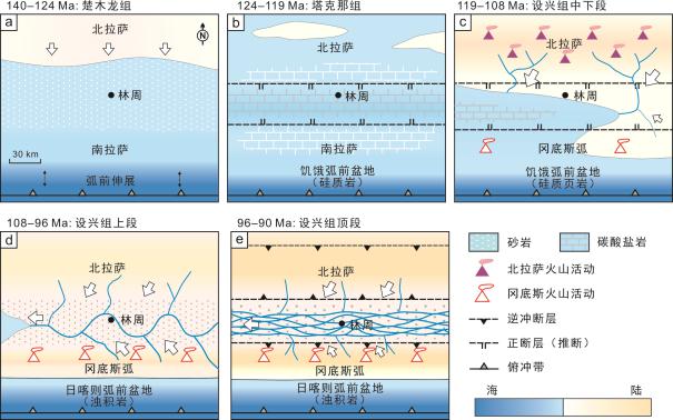 图10 拉萨地体白垩纪古地理,显示从弧后伸展到安第斯型造山的演化过程(Wang et al., 2020)。