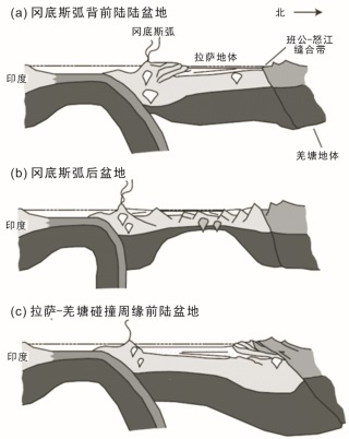 拉萨地体白垩纪的构造背景至少有三种模型(图3, Leier et al., 2007):(1)弧背前陆盆地模型。这种模型认为拉萨地体之上的白垩系碎屑岩的物源区为冈底斯弧,而这一时期的碳酸盐岩和泥质岩沉积于弧背前陆盆地的前隆-隆后沉积区。(2)弧后盆地模型。这种模型认为拉萨地体在白垩纪时期经历了弧后伸展,伸展作用为大量浅海相灰岩-碎屑岩沉积提供了可容纳空间。(3)拉萨-亚洲碰撞周缘前陆盆地模型。这种模型认为拉萨地体的古地理演化主要受拉萨与亚洲大陆(羌塘)的碰撞作用所控制,主要发育碰撞有关的周缘前陆盆地。这种模型认为拉萨地体之上的下白垩统碎屑岩的物源区为拉萨-羌塘碰撞带,而广泛出现的碳酸盐岩沉积为周缘前陆盆地的前隆-隆后沉积。
