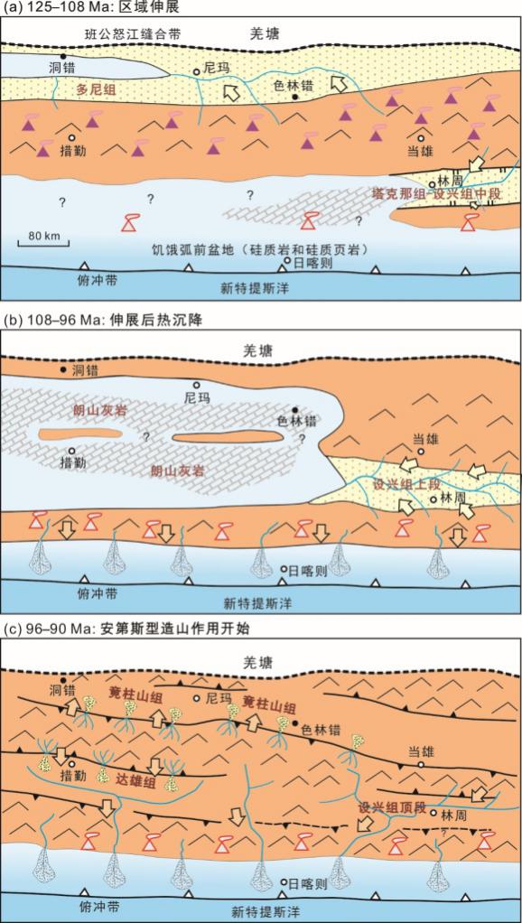 林周盆地的沉积物源和沉降历史反映复杂的构造演化(图8)。林周盆地白垩纪碎屑岩中不含班怒带的碎屑物质,因此不属于拉萨-羌塘碰撞有关的周缘前陆盆地;而且,碎屑物质也并非全部来源于盆地南侧的冈底斯弧,亦不能用弧背前陆盆地来解释。相反,林周盆地的演化符合伸展盆地的特征。沉降曲线显示“上凹”的形状,反映早期强烈的岩石圈伸展和伸展后热沉降过程。快速沉降时期,盆地发生海侵、沉积物向上变细。而且,弧后伸展作用可以为林周盆地白垩系巨厚的沉积物(> 4 km)提供可容纳空间,从且维持沉积环境一直在海平面附近。