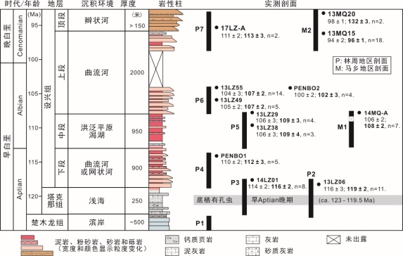 针对拉萨地体白垩纪构造背景的争议,本次工作对拉萨地体东南部林周盆地的白垩系地层开展了系统的研究工作。林周盆地位于拉萨市北侧马乡-林周一带,在构造位置上位于冈底斯和北部拉萨地体界线附近(图4),是拉萨地体南缘唯一完整保存侏罗-白垩系地层的沉积盆地。盆地中的白垩系地层主要包括楚木龙组、塔克那组和设兴组,各地层单元之间均为整合接触(图5)。楚木龙组主要由岩屑石英砂岩和少量含砾砂岩、泥质岩组成,沉积于近岸河流-滨岸沉积环境,古水流方向主体向南,沉积厚度约500米,沉积时代为?143‒124 Ma。塔克那组由圆笠虫灰岩、细砂岩和杂色泥质岩组成,沉积于潟湖-海岸平原沉积环境,厚度约250米,沉积时代为~124‒119 Ma。设兴组主体为一套陆相红层,沉积厚度超过4 km。根据岩性组合的差异,可将设兴组分为下段(119‒113 Ma)、中段(113‒108 Ma)、上段(108‒96 Ma)和顶段(96‒92? Ma)四个岩相单元。下段为河流相砂泥岩沉积,古水流向南;中段主要为洪泛平原泥质岩沉积,偶尔受到海侵作用影响而沉积少量泥灰岩和介壳灰岩;上段为典型的河流相砂岩夹泥岩,古水流主体向西;顶段以粗碎屑岩为主,为辫状河沉积,显示沉积环境显著变化。