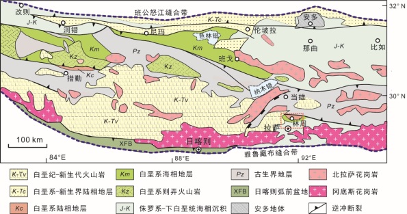 新特提斯洋(雅江洋)是中生代时期位于北方欧亚大陆和南方冈瓦纳大陆之间,近东西向沿赤道展布的一个古大洋。它在中生代早期因冈瓦纳大陆北缘的伸展作用而开启,并在新生代早期因印度-亚洲大陆的碰撞而消亡。在中生代中晚期,新特提斯洋壳向北俯冲至欧亚大陆之下,在欧亚大陆南缘形成了活动大陆边缘。拉萨地体位于欧亚大陆最南缘,是新特提斯洋亚洲活动大陆边缘演化最直接的记录者(图2)。