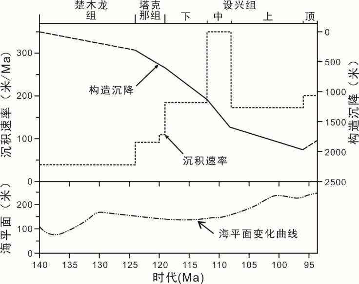 构造沉降分析显示,林周盆地的白垩纪沉降历史可划分为四个阶段(图7):楚木龙组沉积时期稳定慢速沉降(~40 m/Ma);塔克那组-设兴组中段快速沉降(~350 m/Ma);设兴组上部中速稳定沉降(~170 m/Ma);设兴组顶部构造抬升。快速沉降时期对应高的沉积速率,因此,林周盆的沉积环境长期维持在海平面附近。