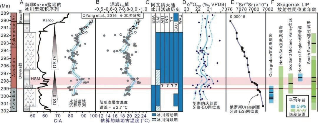 图6华北永城盆地石炭纪末-早二叠世的化学风化趋势、陆地古温度及其与同期南非Karoo盆地沉积序列、热带海水O-Sr同位素和Skagerrak大火成岩省(LIP)形成时代对比