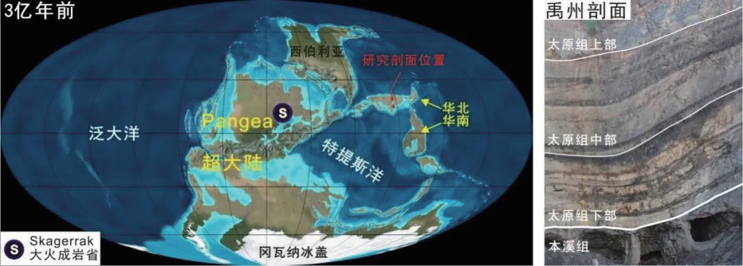 图4(左)3亿年前全球古地理和古板块重建图和(右)河南禹州剖面的本溪组和太原组