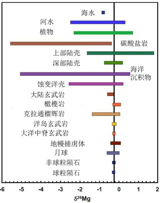 图2.不同储库的Mg同位素组成(修改自Teng et al., 2017)